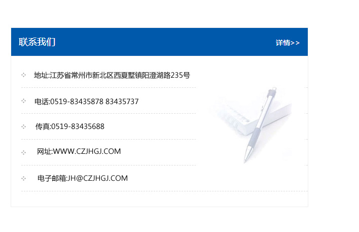 地址:常州市新北區友邦商務大廈1幢16、17層  電話:0519-85101652  傳真:0519-85112595  郵編:213022  網址:www_cz-jiayue_cn.scbaiduzs.com  郵箱:xiajifengaa@163.com